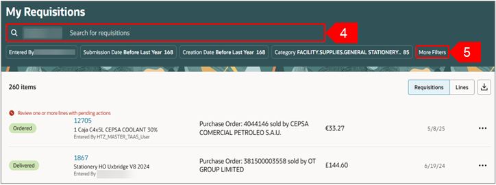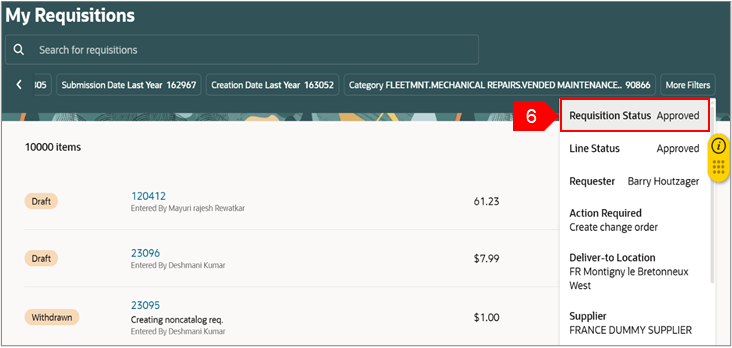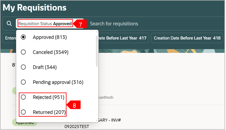 Note: You can see Rejected or Returned label on the requisition shown in the red box below.