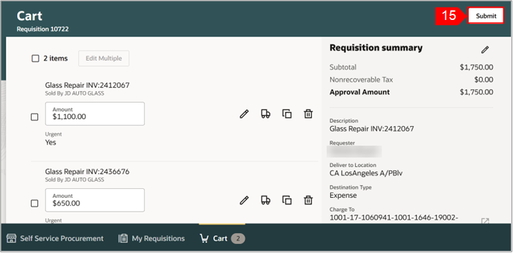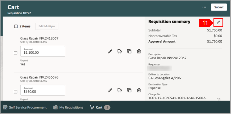 Select Edit icon (pencil) of Requisition summary to make changes at header level.