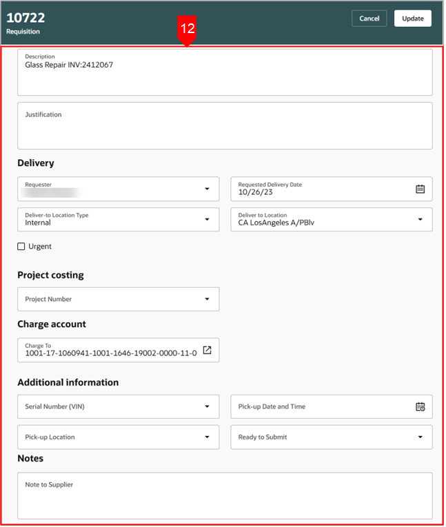 Review or edit the details for each line. Update the requester if ordering for someone else, always update the requested delivery date, when necessary, add notes and attachments for back up.