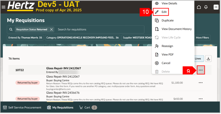 You may need to make a change or add an attachment after it has been rejected by an approver or returned by the Buying Center.