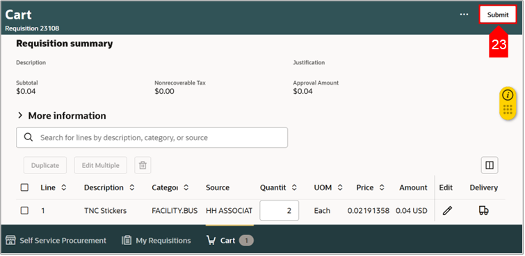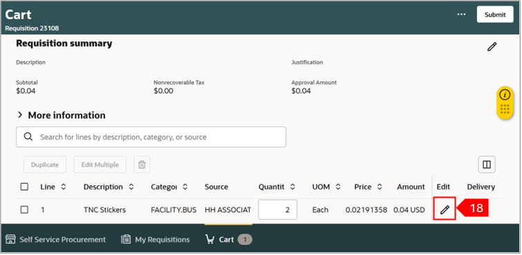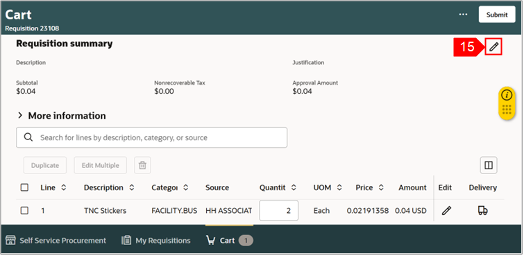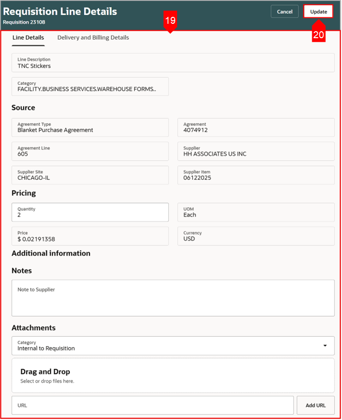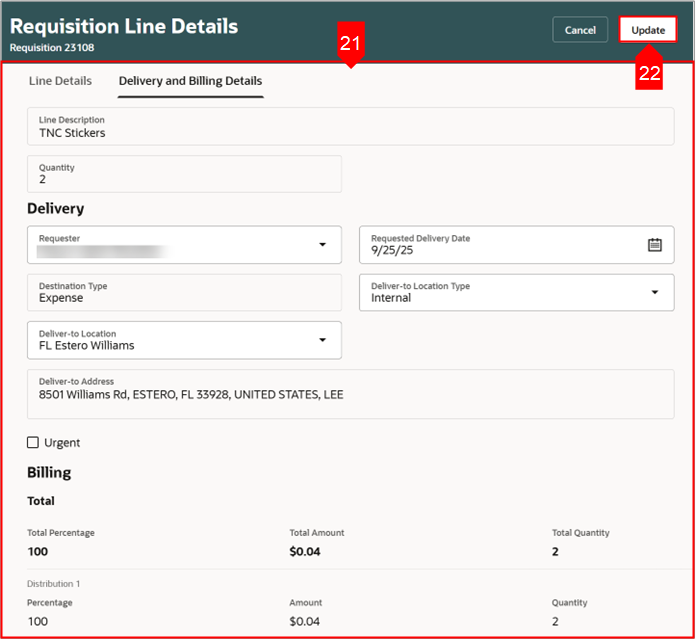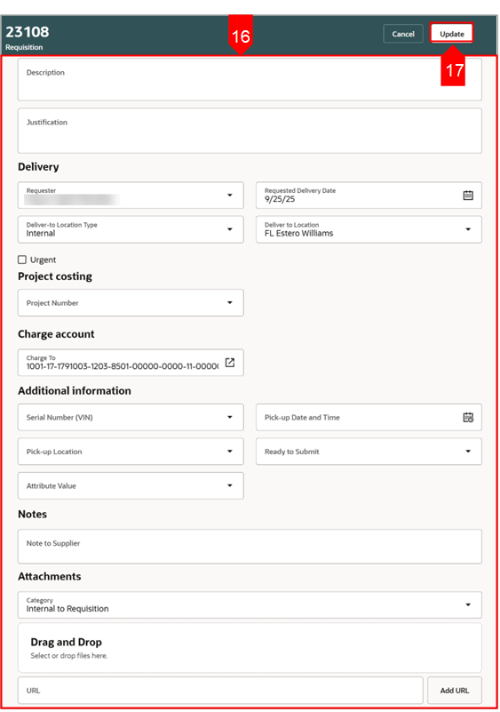 Geben Sie die Details in die entsprechenden Felder ein. Überprüfen oder bearbeiten Sie die Details für jede Zeile. Aktualisieren Sie den Anforderer, wenn Sie für eine andere Person bestellen, aktualisieren Sie immer das angeforderte Lieferdatum, fügen Sie bei Bedarf Notizen und Anhänge zur Sicherung hinzu.