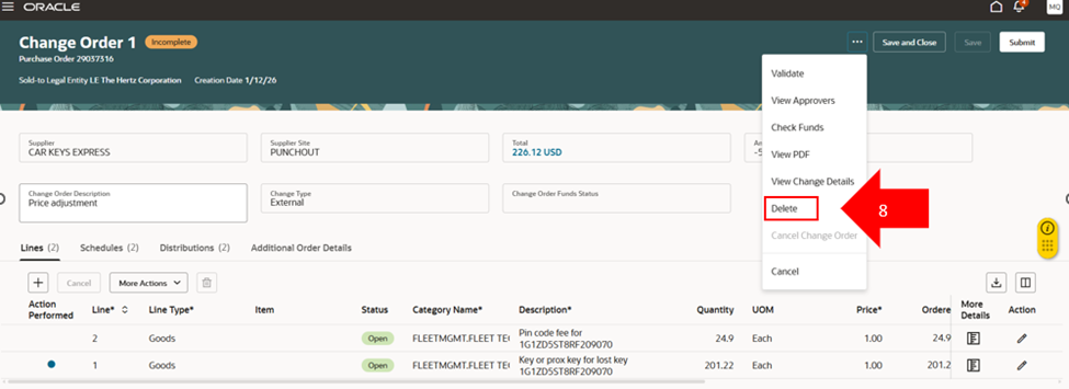 Quando modifichi una modalità di ordine di modifica (PO), se scegli di non procedere o ricevi un errore e non sei sicuro di cosa fare, devi cancellare la modifica.