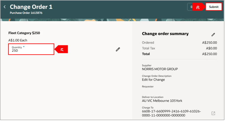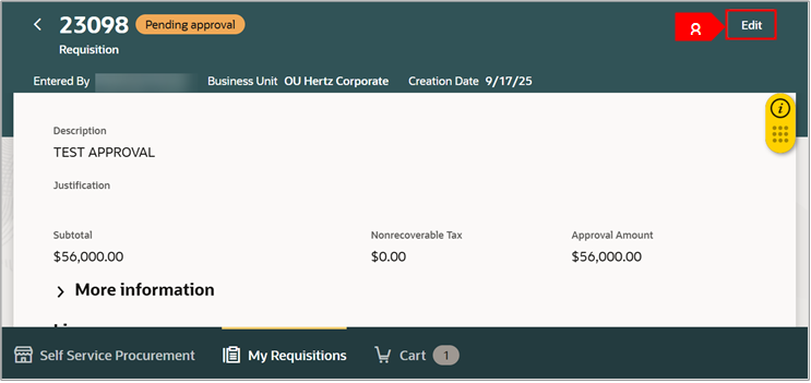 1. Sélectionnez l 'icône Modifier (crayon) du récapitulatif de la réquition pour apporter des modifications au niveau de l'en-tête.