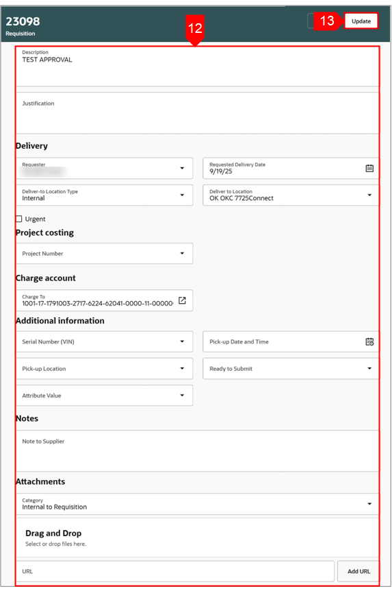 1. Vérifiez ou ajoutez des détails : vérifiez le nom du demandeur, livrez à l'emplacement (la BU et le pays doivent correspondre), mettez à jour la date de livraison demandée, ajoutez une note ou des pièces jointes. demandée, ajoutez une note ou des pièces jointes.