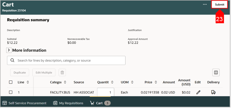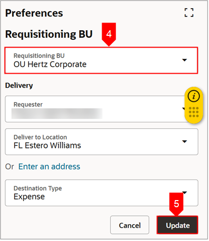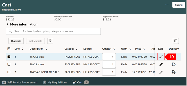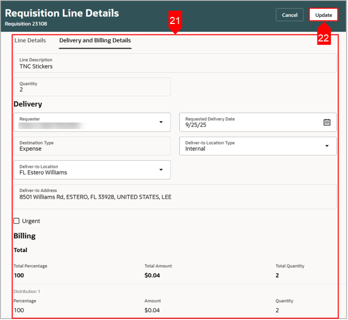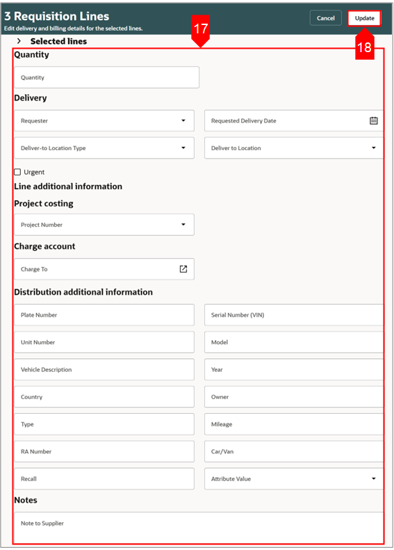 Hinweis: Das Feld "Linie bearbeiten" wird mit allen ausgewählten Linien angezeigt. Aktualisieren Sie den Namen des Anforderers und das angeforderte Zustellungsdatum und stellen Sie sicher, dass der Lieferort mit der gleichen Geschäftsbereichsregion wie der Anforderer übereinstimmt. Beispiel: Wenn REQ in Hertz Rent-A-Car US erstellt wird, muss sich der Lieferort des Anforderers in den USA befinden. Wenn nicht, aktualisieren Sie die US-Adresse manuell. Wenn Sie fertig sind, wählen Sie OK aus.