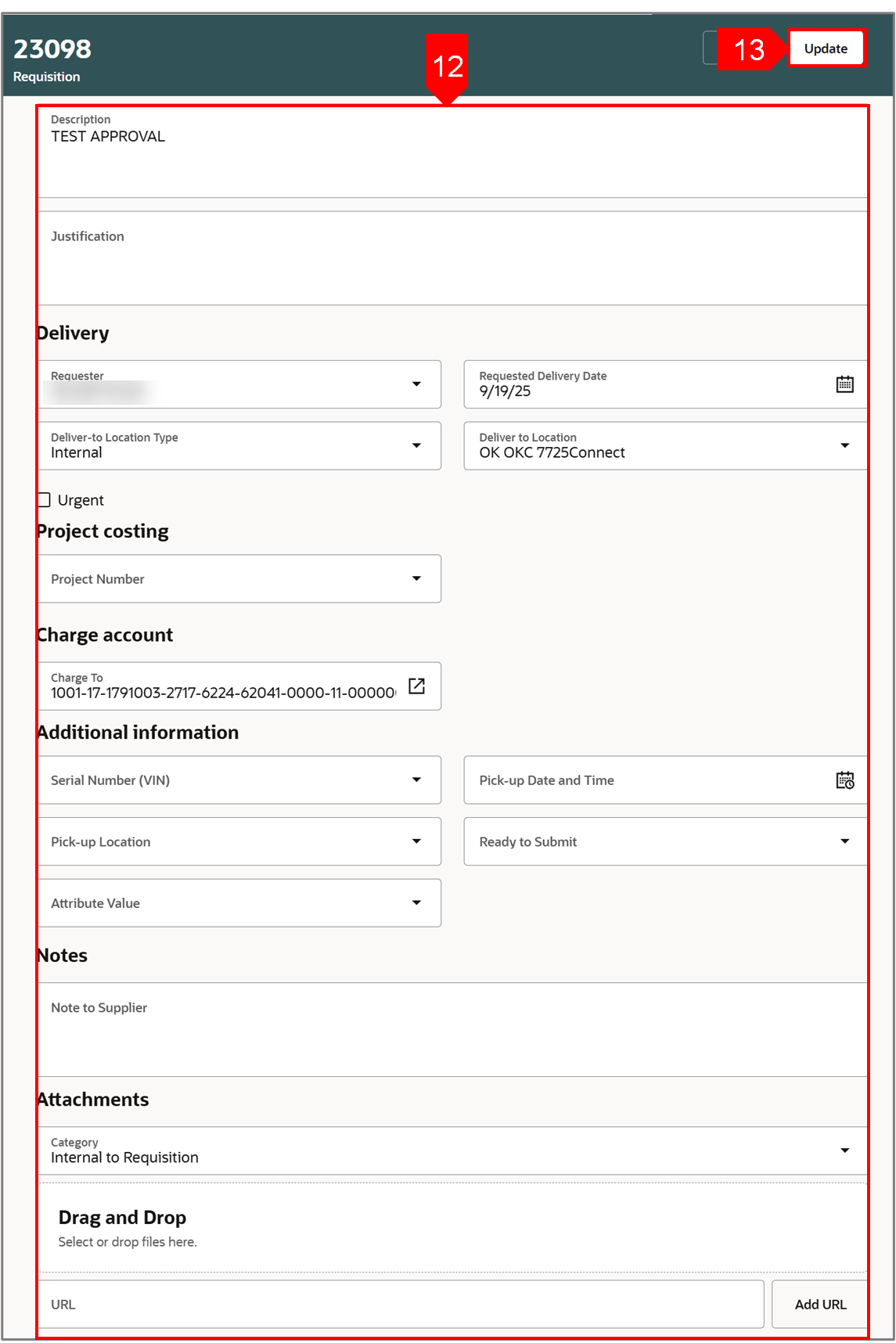 Review or add details: check requester name, deliver to location (BU and country must match), update requested delivery date, add note or attachments.