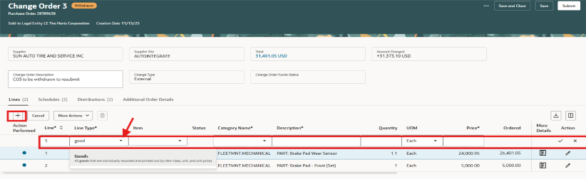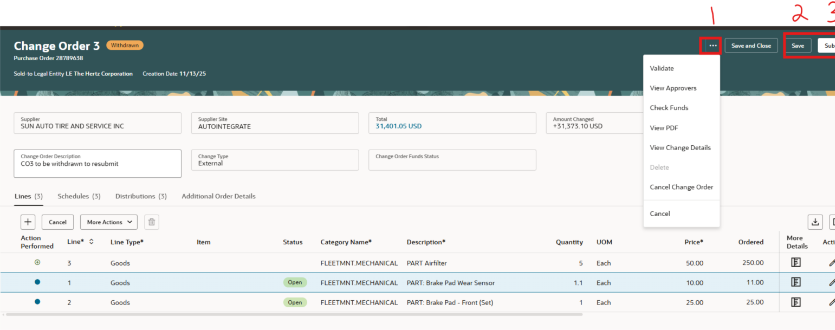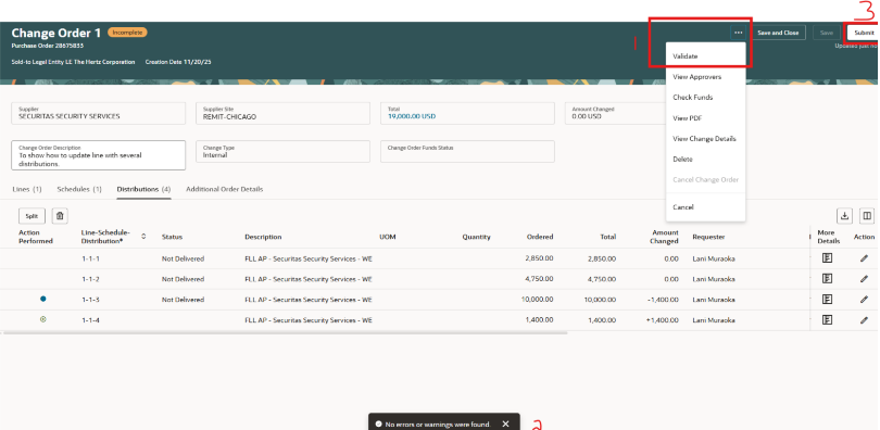 Al finalizar el cambio, usa las puntos suspensivos (3 puntos) para ver las opciones del menú. Validar comprobará los cambios para confirmar si hay errores. Consulta a los aprobadores para comprobar las aprobaciones requeridas. Consulta los detalles de los cambios para ver actualizaciones, cancela el orden de cambio. Cancelar cancelaría la orden de compra. NOTA: si se aplican recibos o facturas, esto no está permitido.