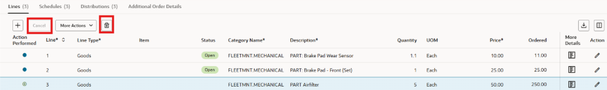 Cancelar no está disponible para la línea 3, pero sí eliminar (cubo de basura), ya que es una línea nueva.