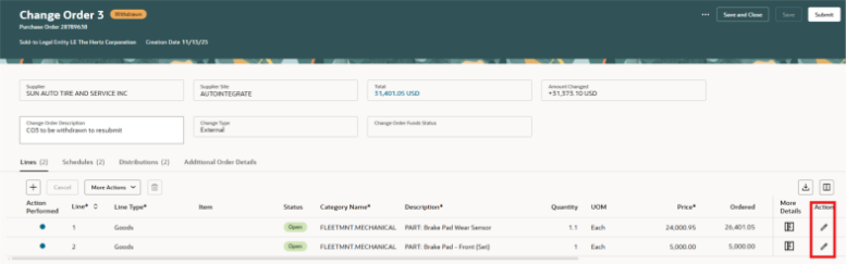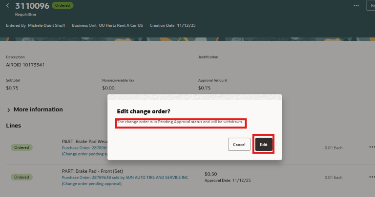 Crea y edita una orden de compra con una orden de cambio pendiente.