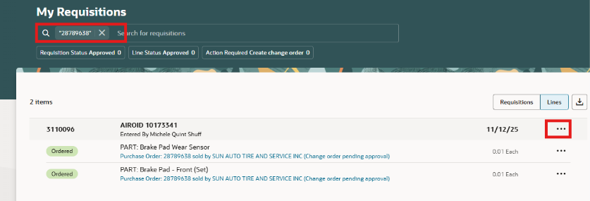 Localiza la orden de compra, selecciona las puntos suspensivos (3 puntos), selecciona editar o ver detalles desde el menú.