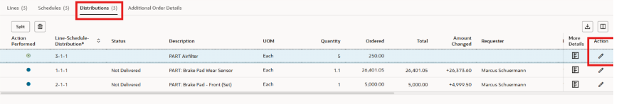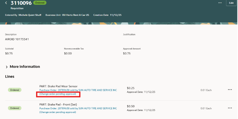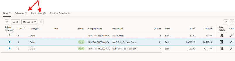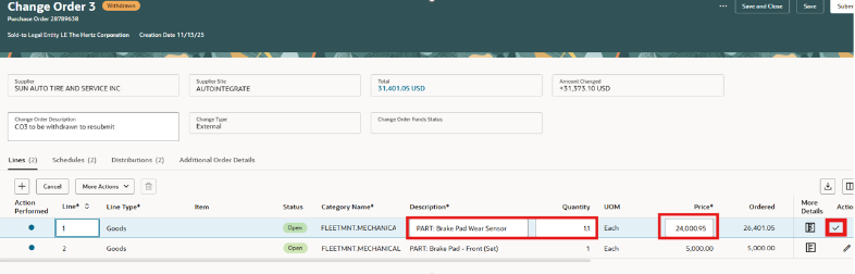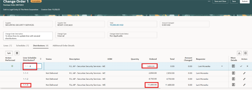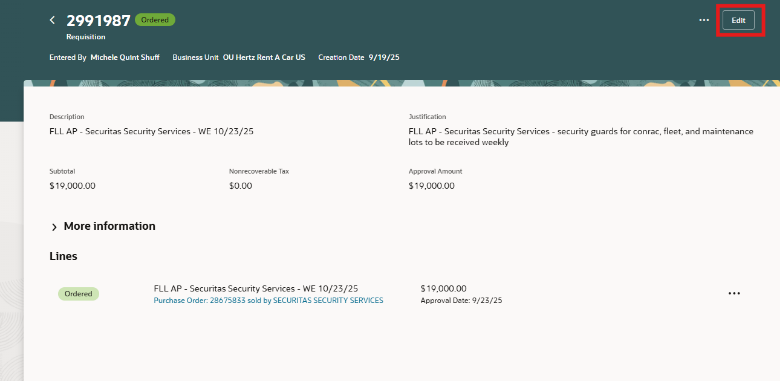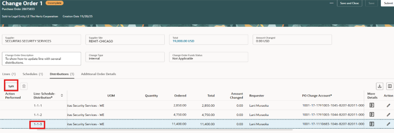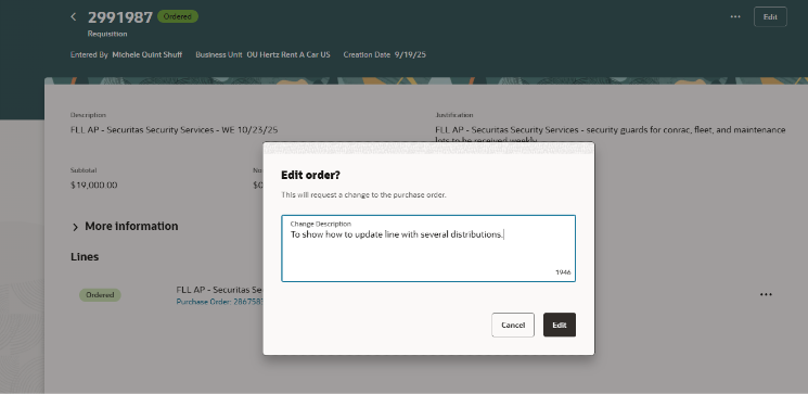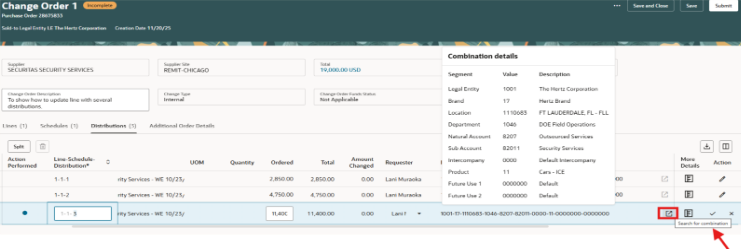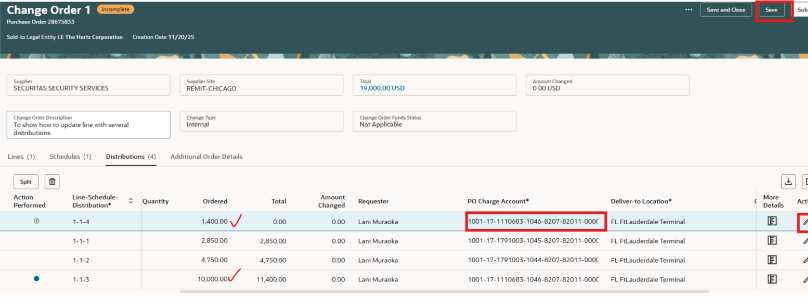 Puedes editar la cantidad (cantidad o pedido) según el tipo. Para editar los segmentos de la cuenta de cargos, añade tu cursor en el segmento para actualizar.