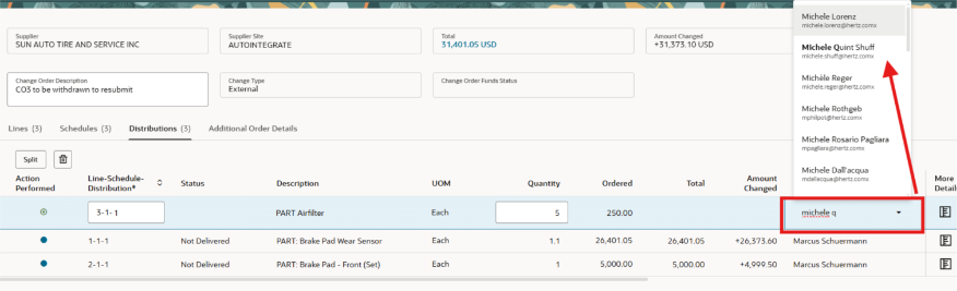 Selecciona la pestaña: por ejemplo, Distribuciones, haz clic en el icono del lápiz, actualiza el nombre del solicitante. NOTA: esta sección es gris pero tiene una flecha en el menú. Escribe parte del apellido y selecciona.