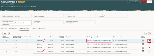 Vous pouvez modifier le montant (quantité ou commandé) selon le type. Pour modifier les segments du compte de charge, ajoutez votre curseur dans le segment pour mettre à jour.